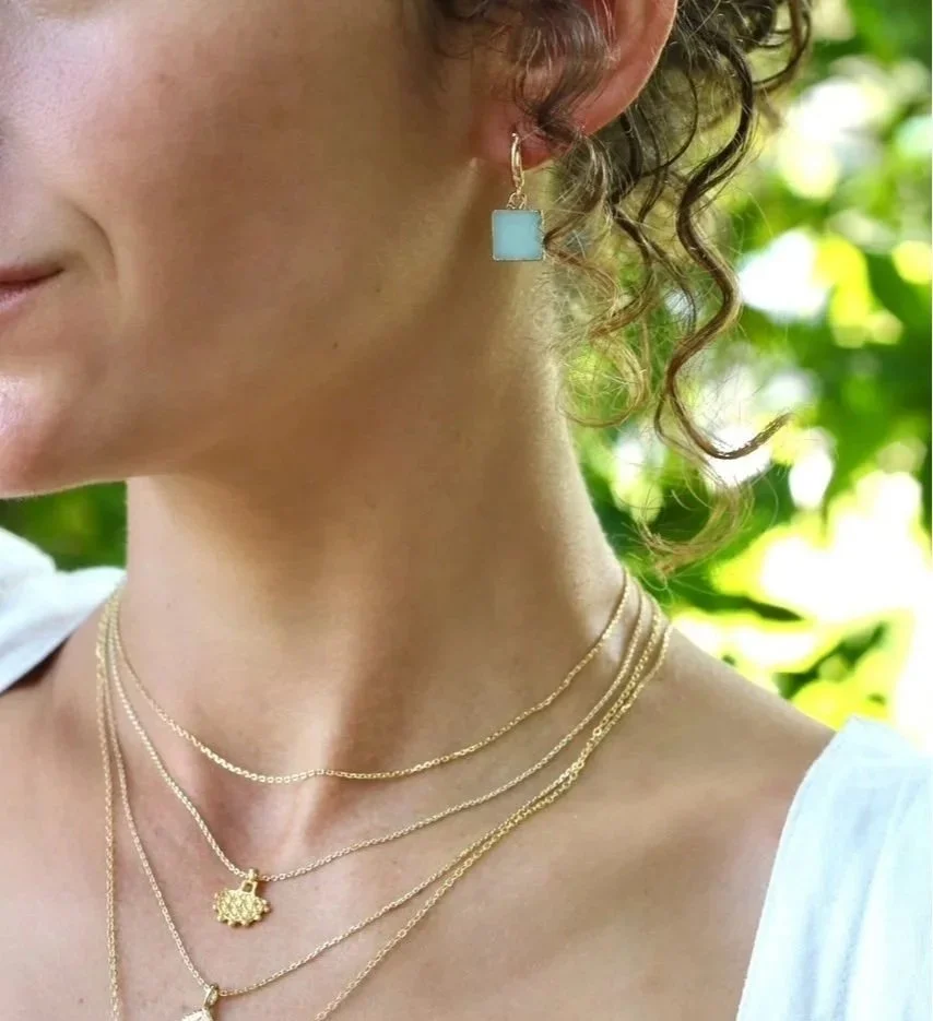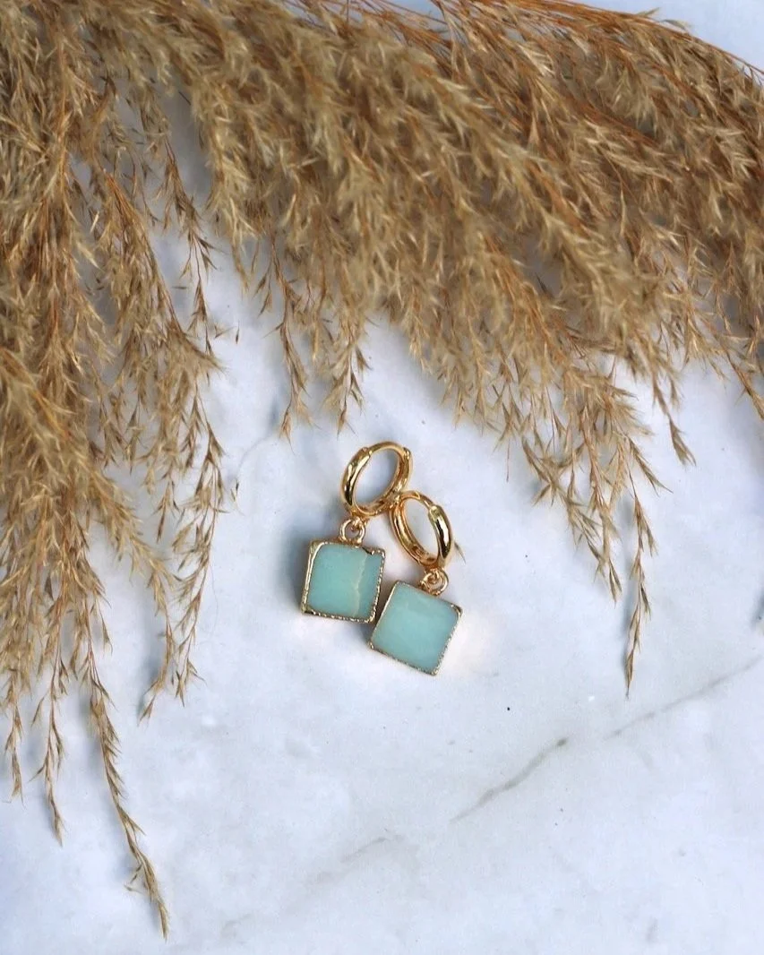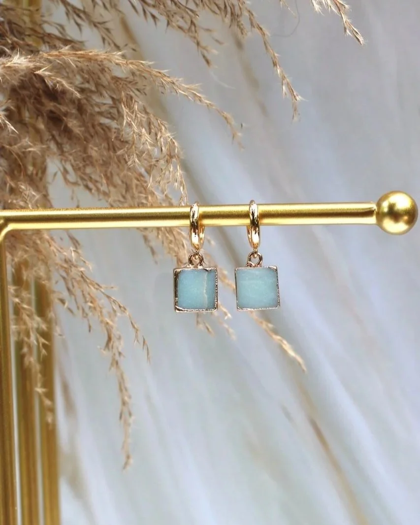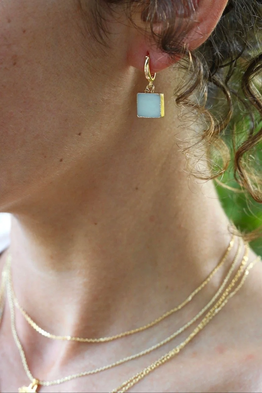 Add soothing color to your look with these stunning earrings featuring vibrant amazonite square charms suspended from elegant 14k gold-filled huggies. The cool, calming blue-green hues of the amazonite create the perfect contrast against the warm glow of the gold, making these earrings a playful yet sophisticated statement piece for any occasion.