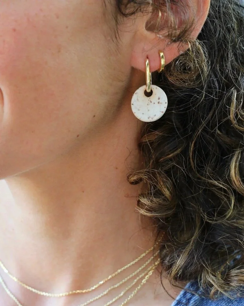 Elevate your everyday look with these playful ceramic earrings featuring charming sphere shapes glazed in a speckled oatmeal finish. Hanging from sleek rectangular hoops, they blend modern geometric vibes with warm, handmade charm—perfect for adding a dash of arty flair to any outfit!