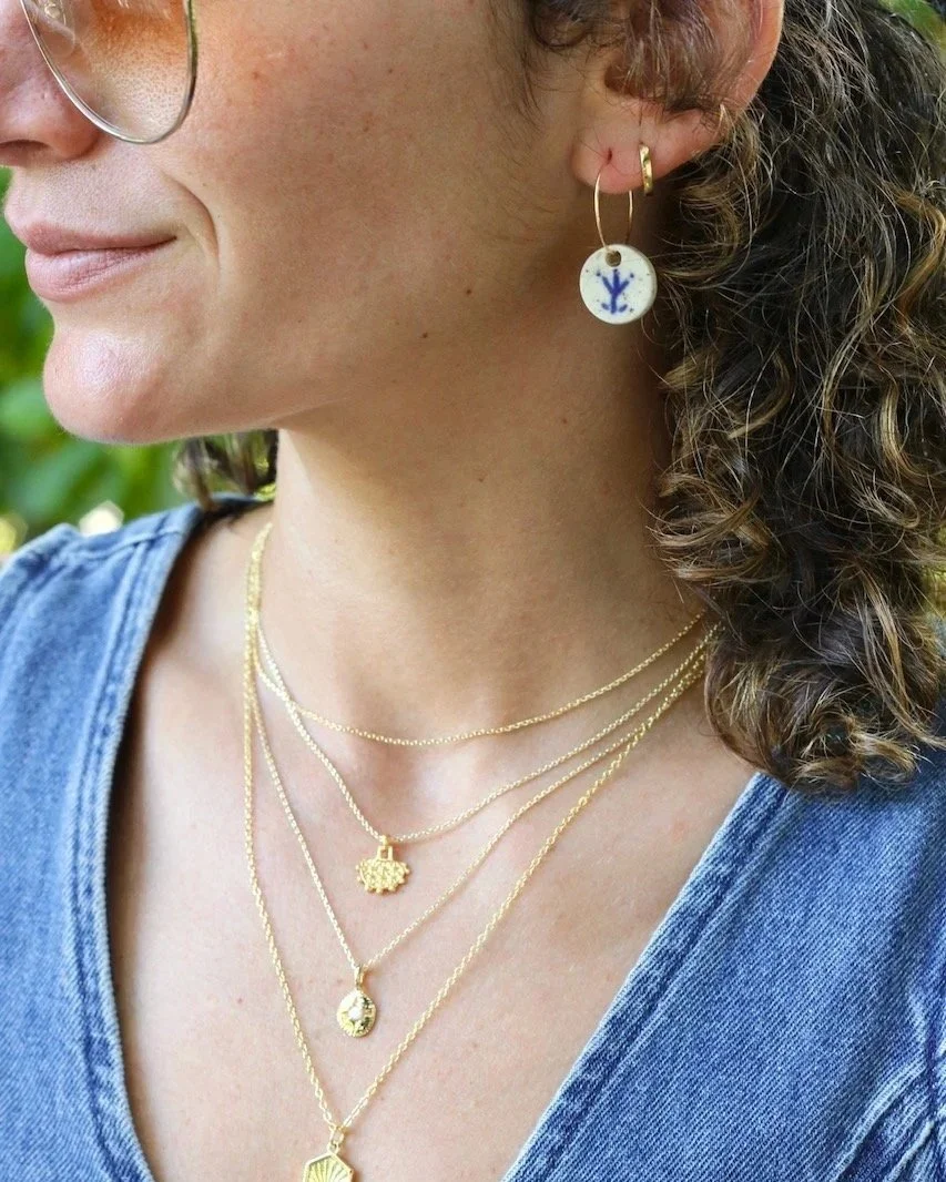 Add a splash of charm to your look with these ceramic earrings, featuring delicate hand-painted blue folk flowers, perfectly paired with elegant 14k gold filled hoops. These earrings bring a playful touch of artistry and timeless style to any outfit.