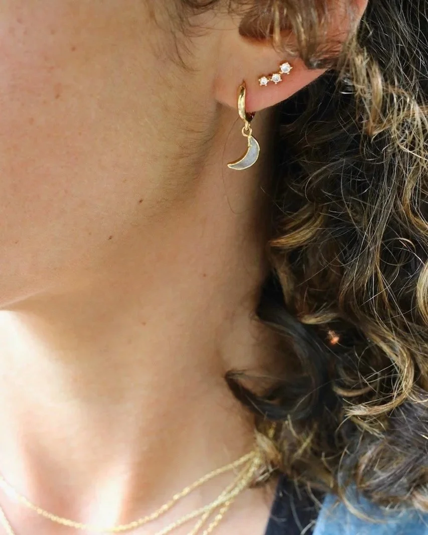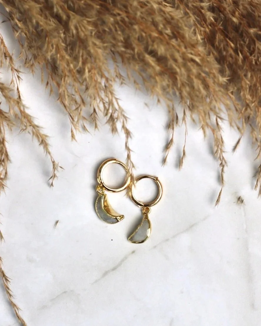 Add a pop of celestial charm to your collection with our rainbow moonstone earrings. Set on 14k gold-filled huggies, each iridescent moonstone dances with flashes of colors, capturing the magic of the moonlight. Perfectly petite, these earrings hug your ears with a cozy comfort while bringing a touch of mystical sparkle to any outfit.