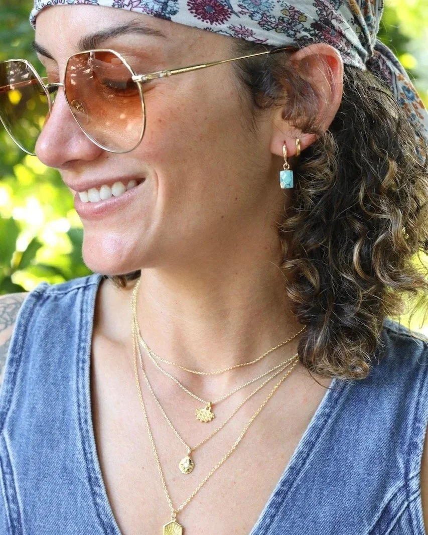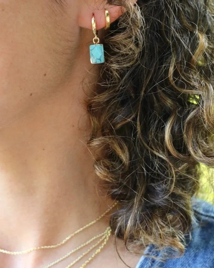 Add a splash of color to your everyday look with these charming 14k gold-filled huggie earrings, featuring a delicate rectangle turquoise charm. Playful yet polished, they’re the perfect pop of turquoise to brighten any outfit.